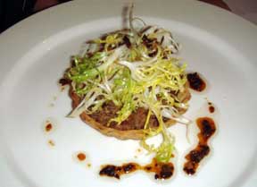 6th and Fitzwater Streets (215) 238-1920 www.saltandpepperbyob.com BYOB Robert Reilly is living the life of. He’s taken over ownership of a former luncheonette-lousy-looking shebang, and turned it into a neatly trimmed Bella Vista shebang-for-your buck restaurant. Reilly himself has the brackish bearded face of a Dutch Master’s self-portrait. His head seems to have longitude without latitude. With hair parted down the middle, and an attached pony-tail of sorts, his visage is almost angelically corpulent, but most calming and inviting. He seemingly enjoys kissing and hugging the neighborhood regulars, grasping the hands and waists of those he doesn’t know, and he contrives to offer a supererogatory welcome that would give Perrier-Starr type restaurateurs urticaria. Salt & Pepper’s light green tiles with a honeydew melon hue pervade the walls. Your eyes follow to fifty short candle-wicks all aglow adjacent to the cooking area, as if what’s being openly prepared there ought to offer heavenliness. Large glass containers line the area, filled with a cornucopia of whole onions, lemons and limes, recreating an extremely modest local-ingredient Garden of Eden. Overhead, halogen track lighting focuses upon Sean Ford, the chef (formerly at Pumpkin) who meanders through his pots, pans and dishes as if he were trying to be devilishly sizzly, noisy and brash. He’s never out of sight nor hearing from any of the two dozen or so seats in this cantankerously cozy establishment. Each table is covered over by crab-house brown bag paper, cut to fit, and adorned with a votive candle. A white tile floor provides surface enough for black-backed wooden chairs whose seats are propped by black cushions. While your brought-from-home wine is being opened, offerings of amuse bouch (avocado-chive skinless dumpling dots) are extended upon baby spoons. Breads are concurrently made available with side containers of herb-loaded olive oil redolent of sage. Service is sage as well. Appetizers on the winter menu not to miss: Seared Scallops, Citrus Salad, Aged Balsamic ($9.75). Two enormous sea-divers are seared perfectly golden on top, and lightly at bottom, in the method preferred by chefs in the know. Therefore the scallops remain pearly and glistening throughout, crisp to the fork’s first touch, and bursting with flavor in one’s mouth. They rest upon a bed of citrus orange and grapefruit slices emboldened by a drizzled balsamic reduction. One’s plate is adorned artistically in swirls of the vinegar to complete. Ford has built a powerful pick-up. Butternut Squash Soup, Braised Short Ribs ($8). A large white bowl is vertiginously filled with soup the color of dawn, upon which has been drawn a happy face with a spotted balsamic smile, a nose of de-boned short-ribs and cheeks of croutons. A meaty flavor adds strength and robustness to a vegetarian base, all of which is sweetly savory and toothsome. The ribs are as buttery as their surroundings, melting inadvertently in a tongue-touch. The crunch of croutons thereafter makes the food three-dimensional, keeping your jaws and mind, swallowing and sighing in syncopation and liquidity. Wild Mushroom Tart, Frisée, Smoked Bacon, Truffle Vinaigrette ($10). Imagine a three-inch diameter pie with scalloped crustiness, upon which a bevy of sliced and oil-softened wild mushrooms lie bare. Purse pinches of properly positioned salad greens as a cover up so that the mushrooms are decently unembarrassed. Then surround the lot with dabs of vinaigrette in which chopped truffles swim abundantly, adding a dollop or two atop, complemented by smoked bacon bits, drippings and oil. The mix is astonishingly soothing and cool on the palate, yet as woodsy and smokey as a charcoal-baked brick-oven pizza. I will not mention entrées such as the Braised Pork Shoulder, Shitake Polenta, and Broccoli Rabe ($19), nor Grilled Skirt Steak, Fingerling Potatoes, Chimichurri and Spinach ($23) except to say that each takes Winter by the throat, and strangles every bit of fidgety frightening frigidty out of it, cloaking your senses warmly with rib-sticking meals meant to be heated and hearty. One complaint: the skirt steak should be ordered from the butcher specifically as “skirt steak #1,” a thinner much more succulent and tender end of the loin piece. Notwithstanding, these marvelous renditions are inventive and enviable. I must discuss the Fish of the Day, which happened to be Grilled Swordfish ($22). A pompous cross-hatched huge portion of swordfish is propped up on a bed of steaming and creamy mashed potatoes. The throne-like mound is surrounded by cut morsels of Brussel sprouts, two French fries and an undercoating sauce rich with mushroom munches and a bacon bacchanal. The fish needs a steak knife to cut its seared flesh precisely, as if it were a filet mignon, because that best describes its texture. Allow the mash and munch to pass between your lips in concert with the fish, and topple your taste buds with the bacon. Spring is around the corner. MATER PULCHRA FILLA PULCHRIOR |